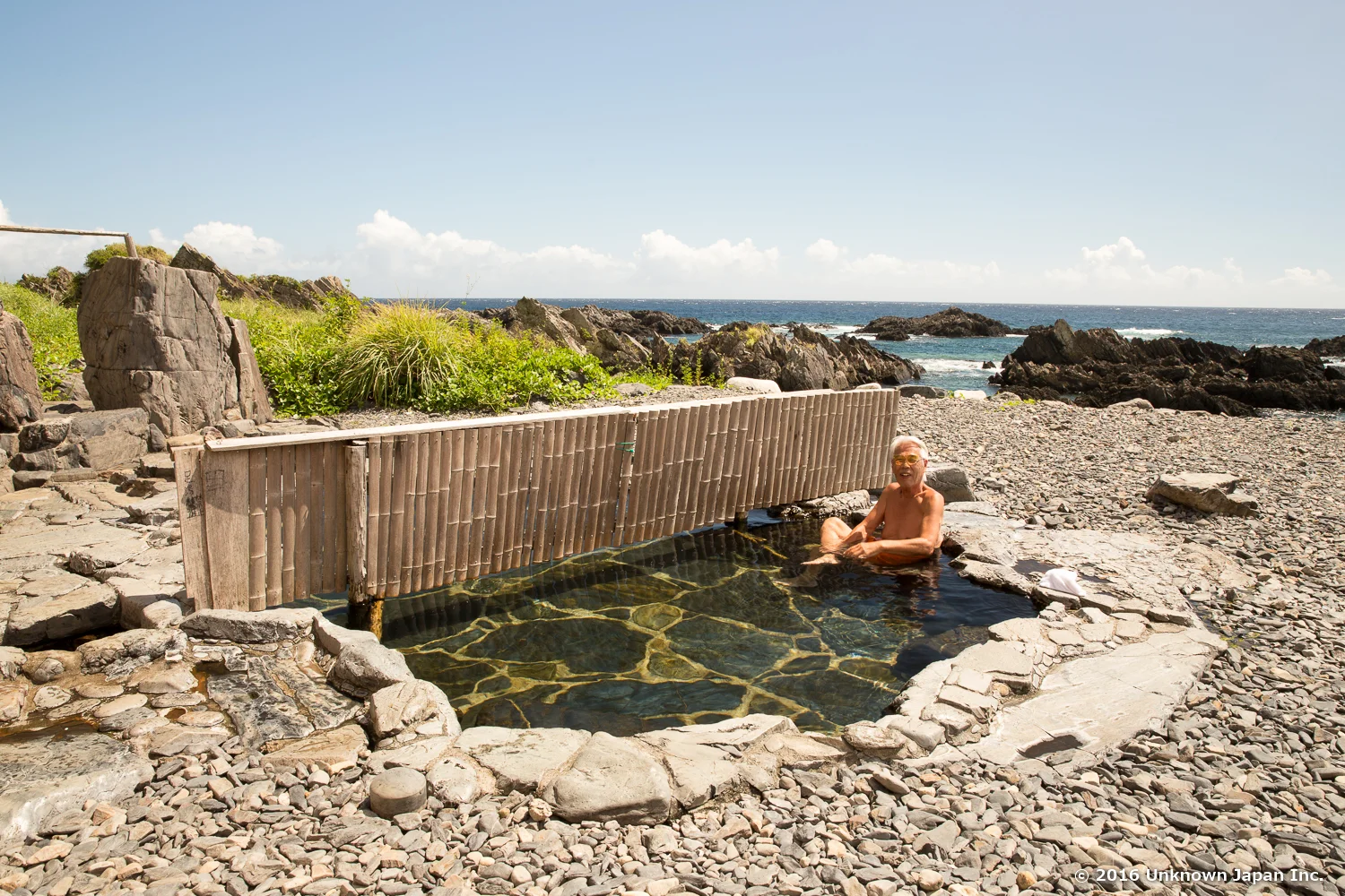 地元の方にも観光客の方にも愛される海辺の温泉の向こうに真っ青な海が一面に広がります。(写真は別荘暮らしのTAKEZOさん)